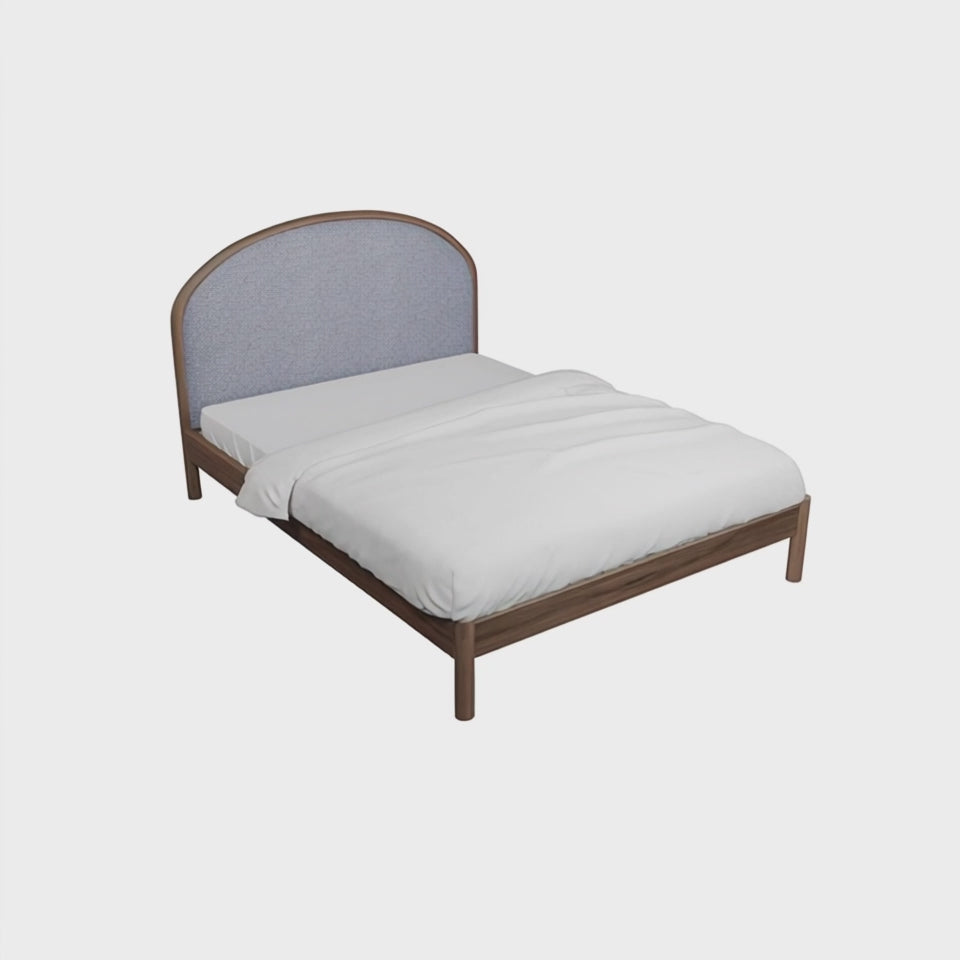 Available in Walnut Brown and Oak finishes with multiple fabric options. The Braxton Bed features a solid wood frame paired with an arched upholstered headboard for a warm and inviting look. Its simple silhouette and sturdy construction make it a stylish and comfortable choice for any bedroom. |