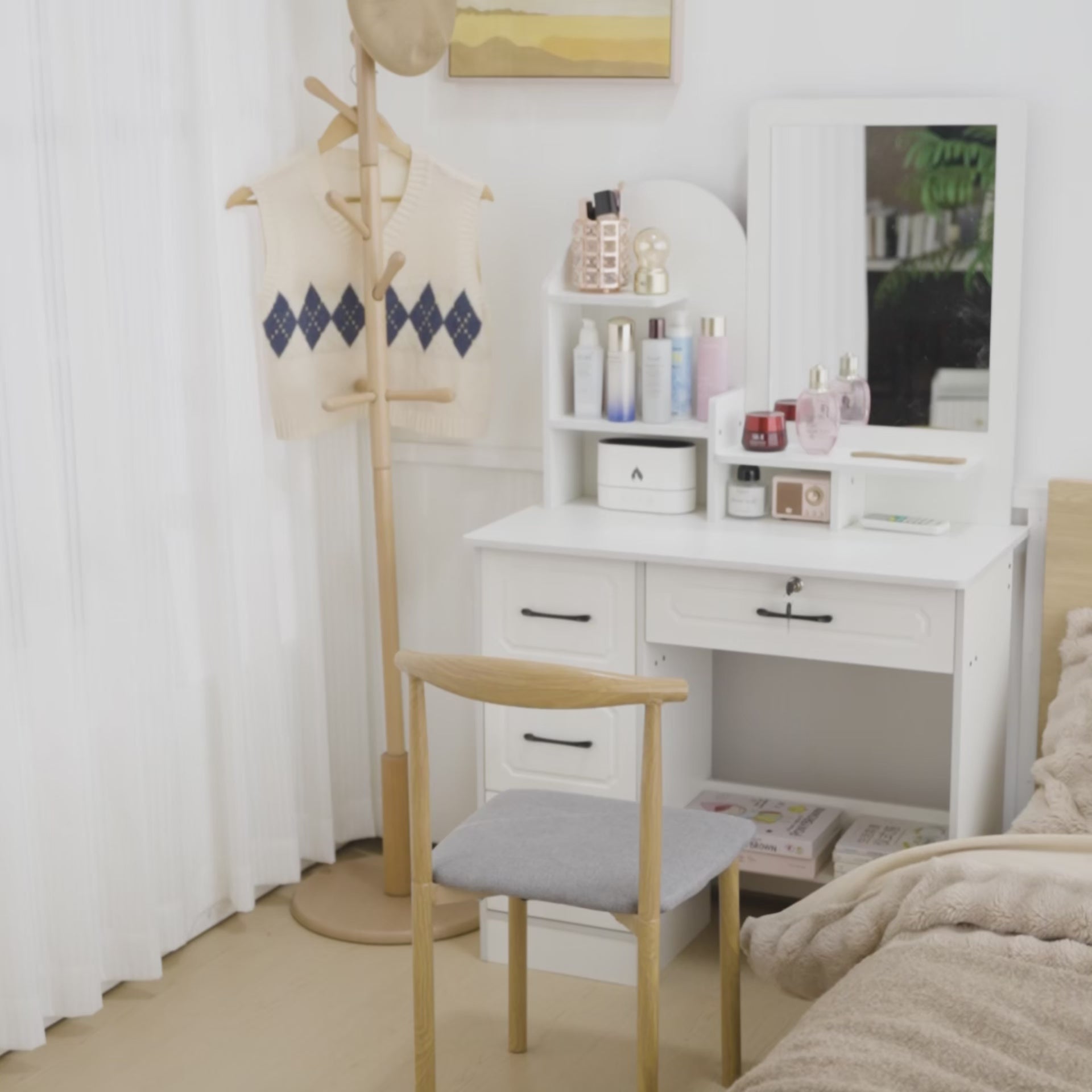 This dresser table is a comprehensive vanity station designed for beauty and organization. |