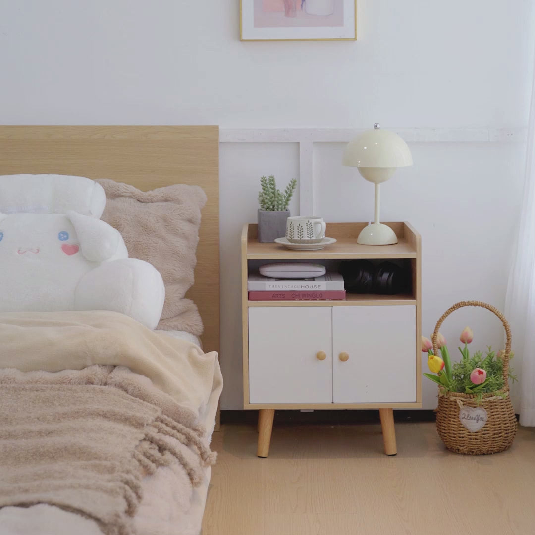 It includes two doors with a wide storage inside, along with an open shelf above, offering convenient storage and effectively declutters the bedroom.