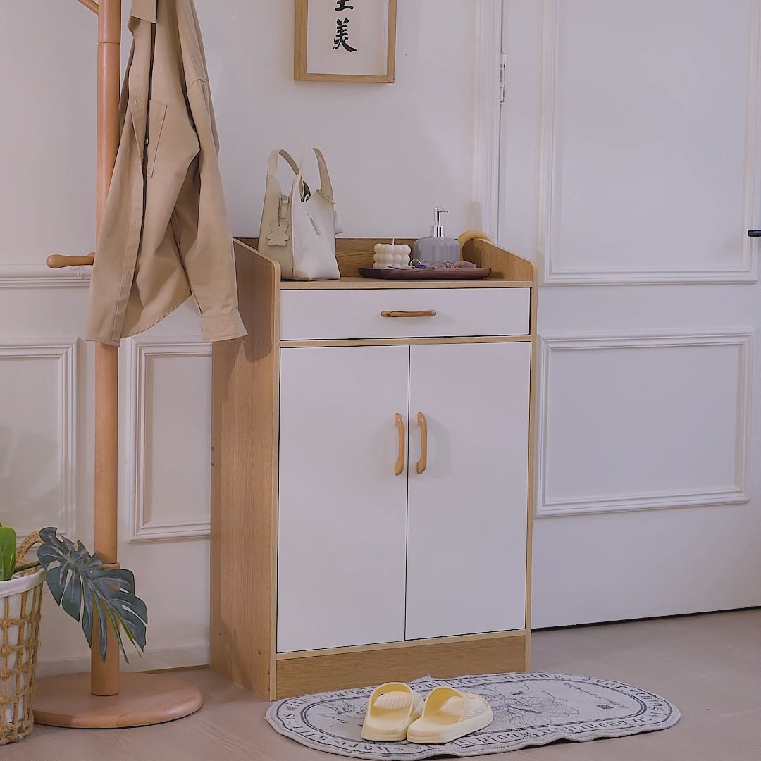 This versatile shoe cabinet is designed to accommodate your footwear collection efficiently, providing ample storage with three spacious shelves discreetly concealed behind two doors. |