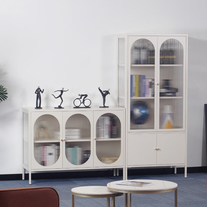Cold-rolled steel sheet and square tube frame with epoxy powder coating, tempered fluted glass, and gold metal door handle. |