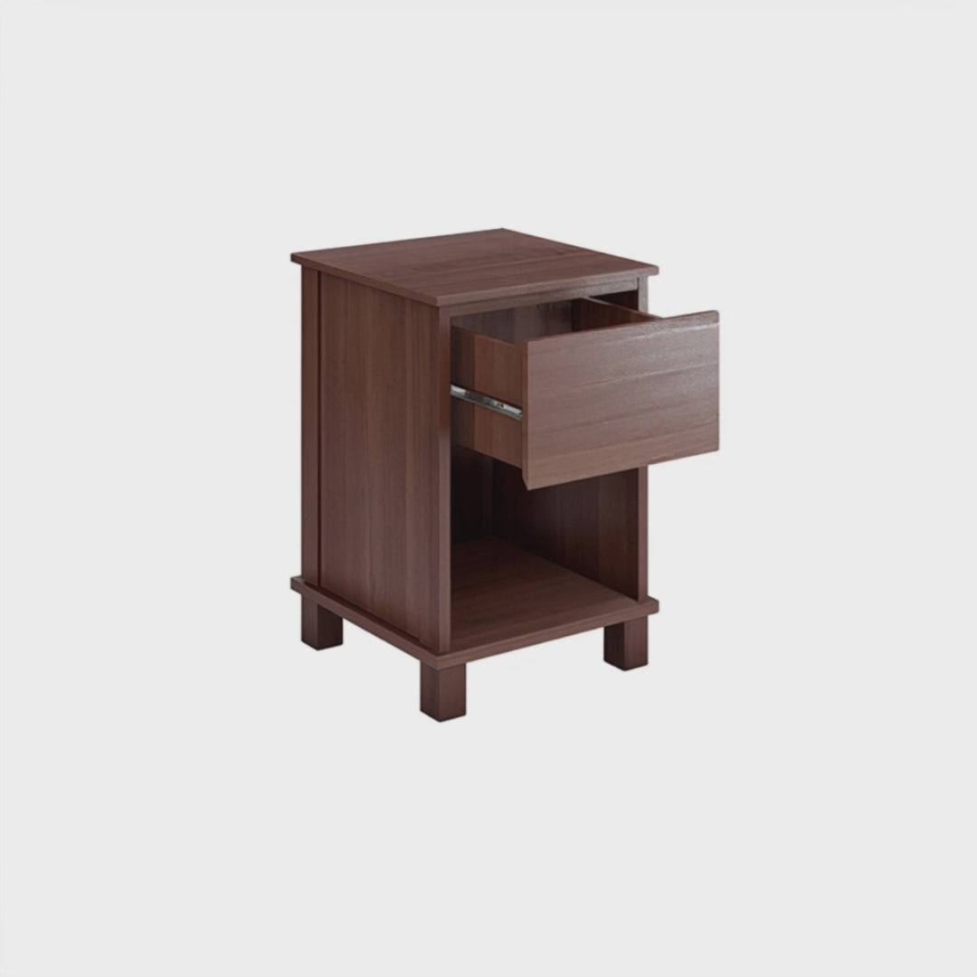 Available in two colors, Oak & Walnut Brown. The Narrow Nightstand provides compact bedside storage with a drawer and open shelf. Built with durable furniture-grade panels and solid pine legs, it offers a sturdy and space-saving solution for everyday essentials. |